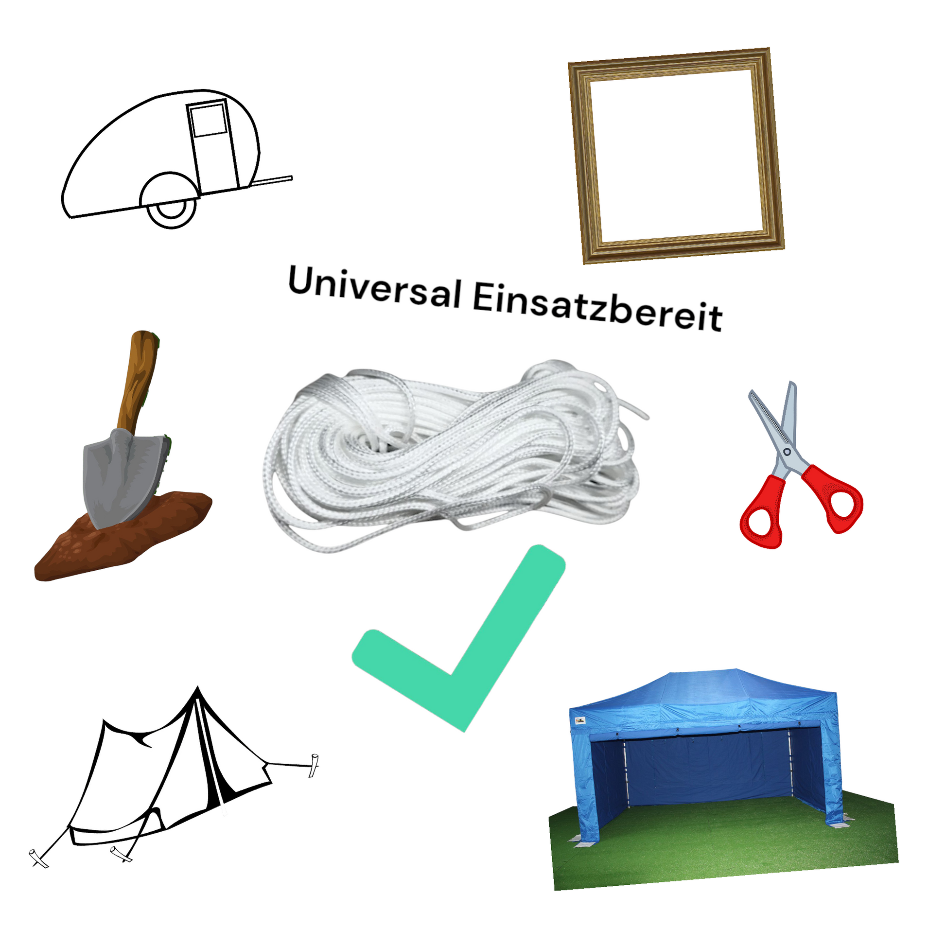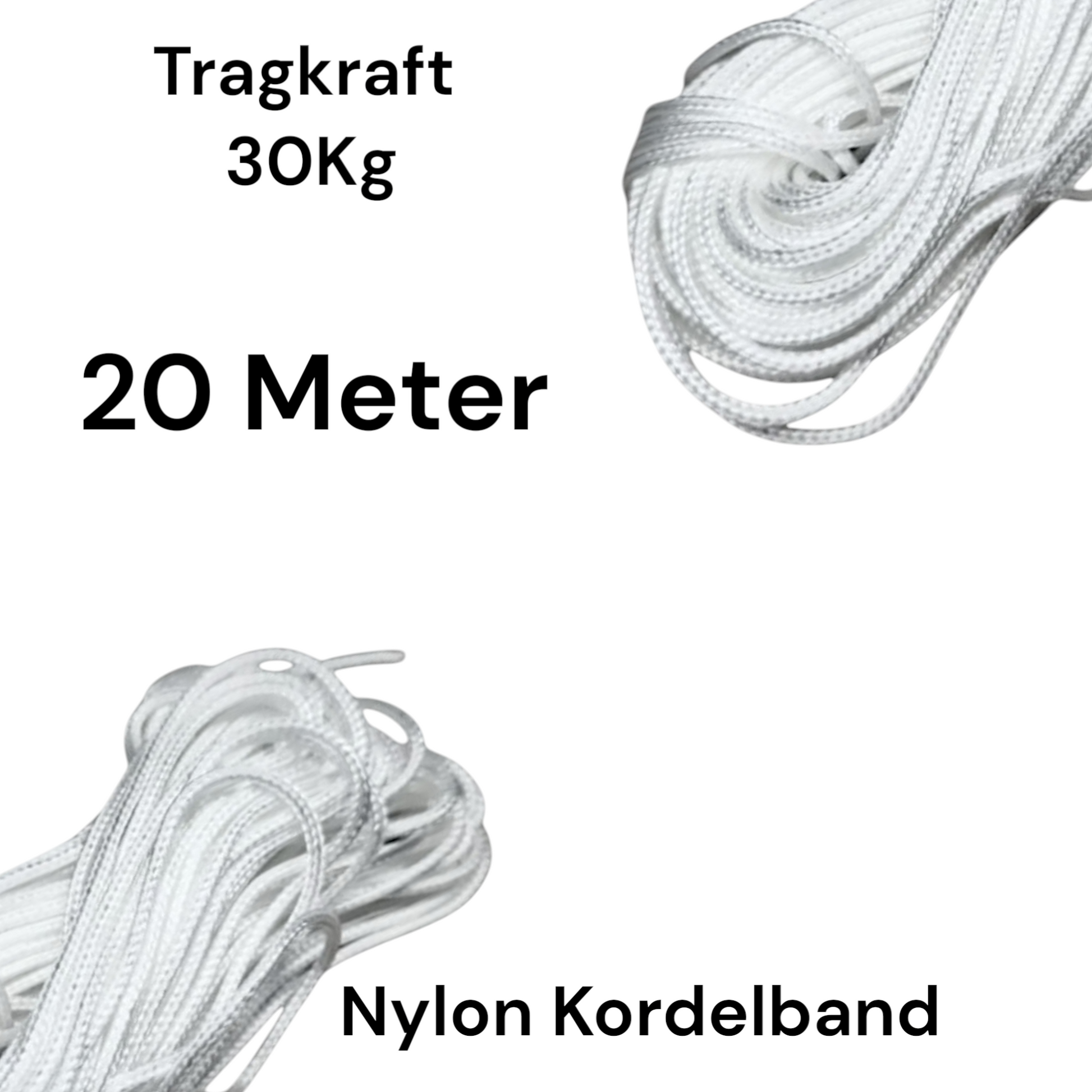 Mit einer Länge von 20 Metern und einem Durchmesser von 2,5 mm können Sie Gegenstände oder Sonnenschirme bis zu 30 kg sicher befestigen.